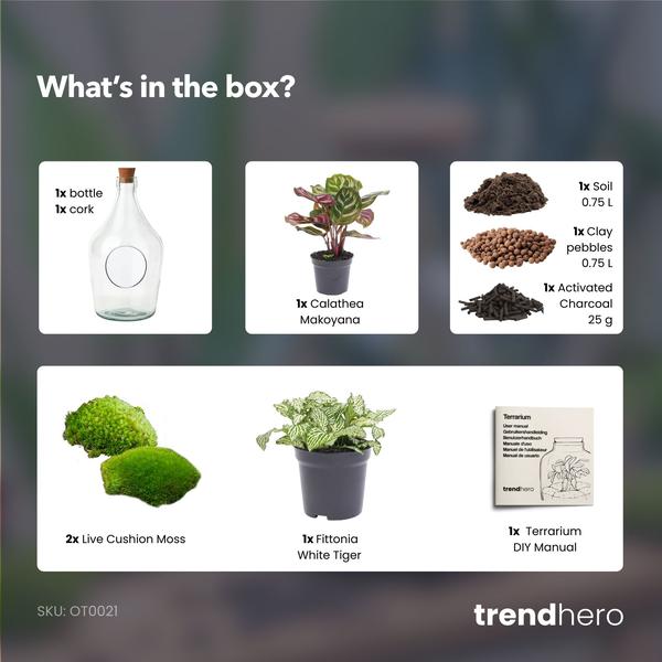 Inclusief: Terrarium start kit S/M, Calathea Makoyana, Fittonia Ruby Lime en verse mos